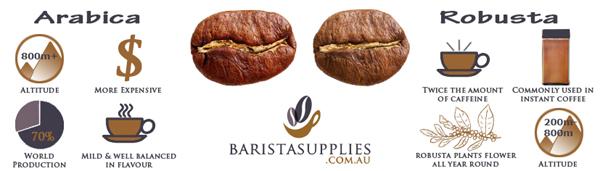 Robusta is more prolific, disease resistant, and higher in caffeine, while Arabica has higher lipids and nearly twice the sugar content of Robusta, resulting in greater acidity and more complex aromas. Robusta is more often used for cheaper coffees, while Arabica is used for fine coffees. there are more subtle classifications of these two coffees, and the two main varieties of Arabica are Bourbon and Typica.